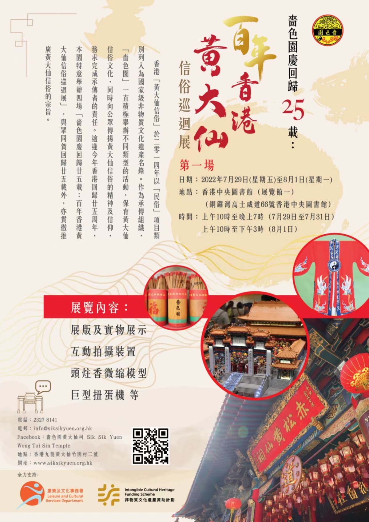 嗇色園一直肩負傳承重任,積極保育及傳揚黃大仙信俗文化,適逢今年是香港回歸祖國25周年,嗇色園獲康樂及文化事務署「非物質文化遺產資助計劃」資助,將於今年7月至11月舉辦共4場「嗇色園慶回歸25載:百年香港黃大仙信俗巡迴展」,公眾可以免費入場參觀。
