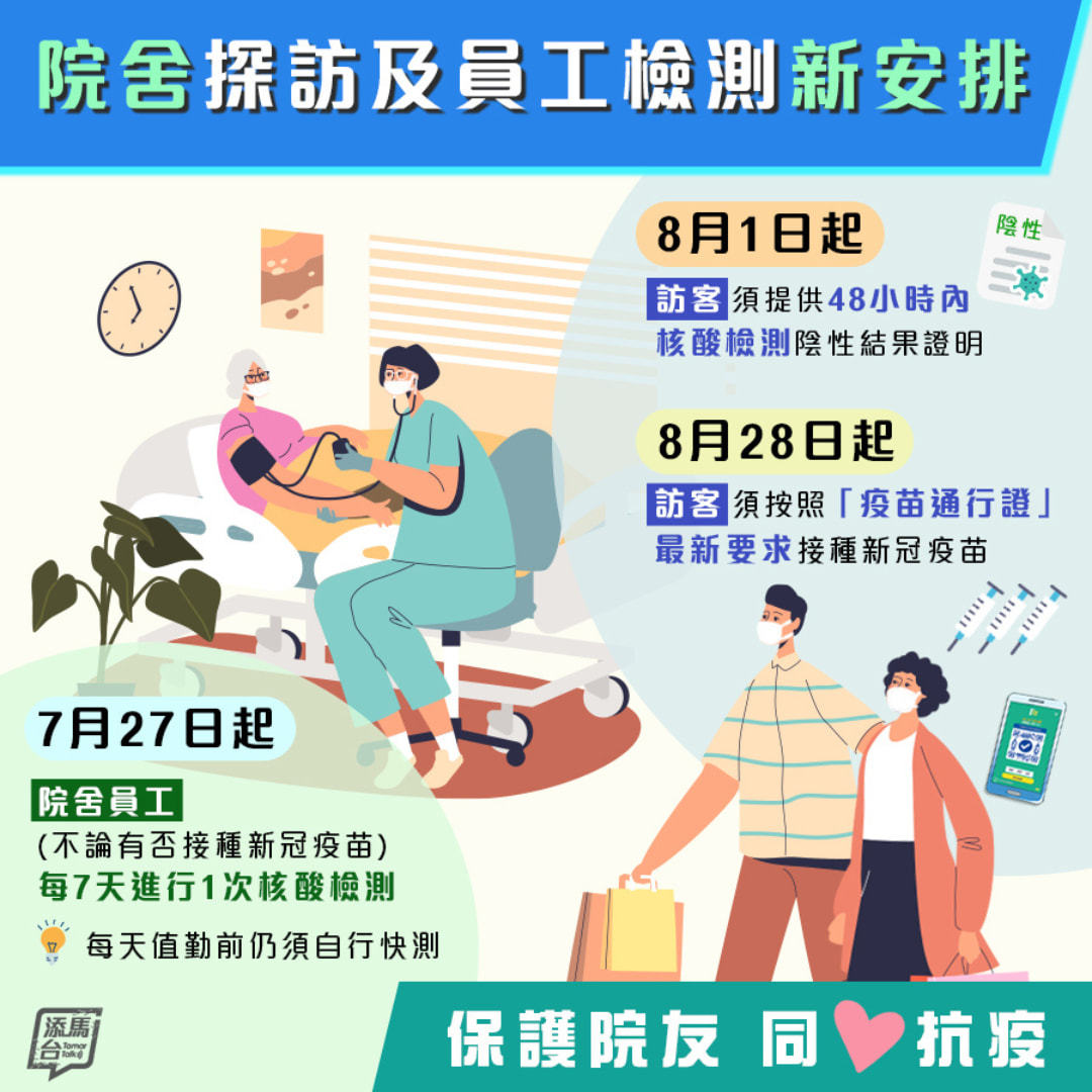 此外,所有探訪人士下月1日起,必須持有探訪前48小時內核酸檢測陰性證明;下月28日起,訪客須按照「疫苗通」最新要求接種疫苗。