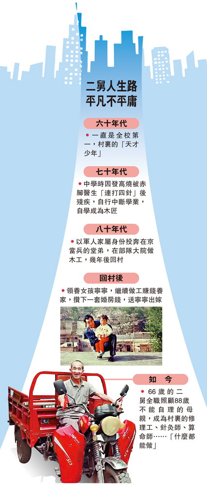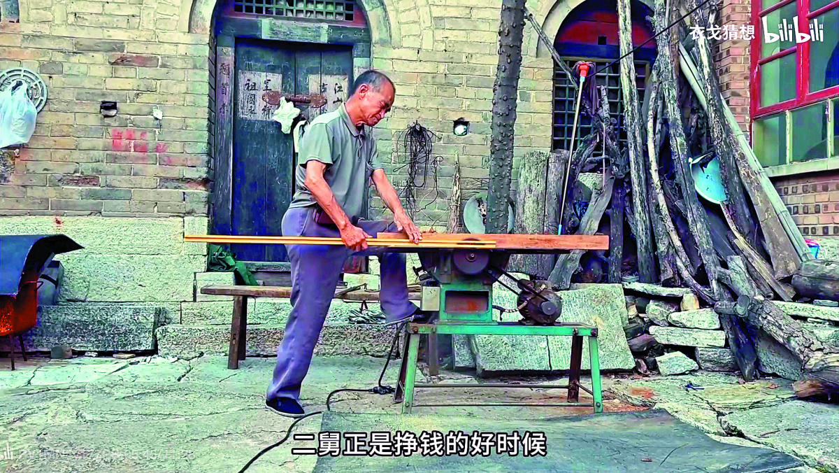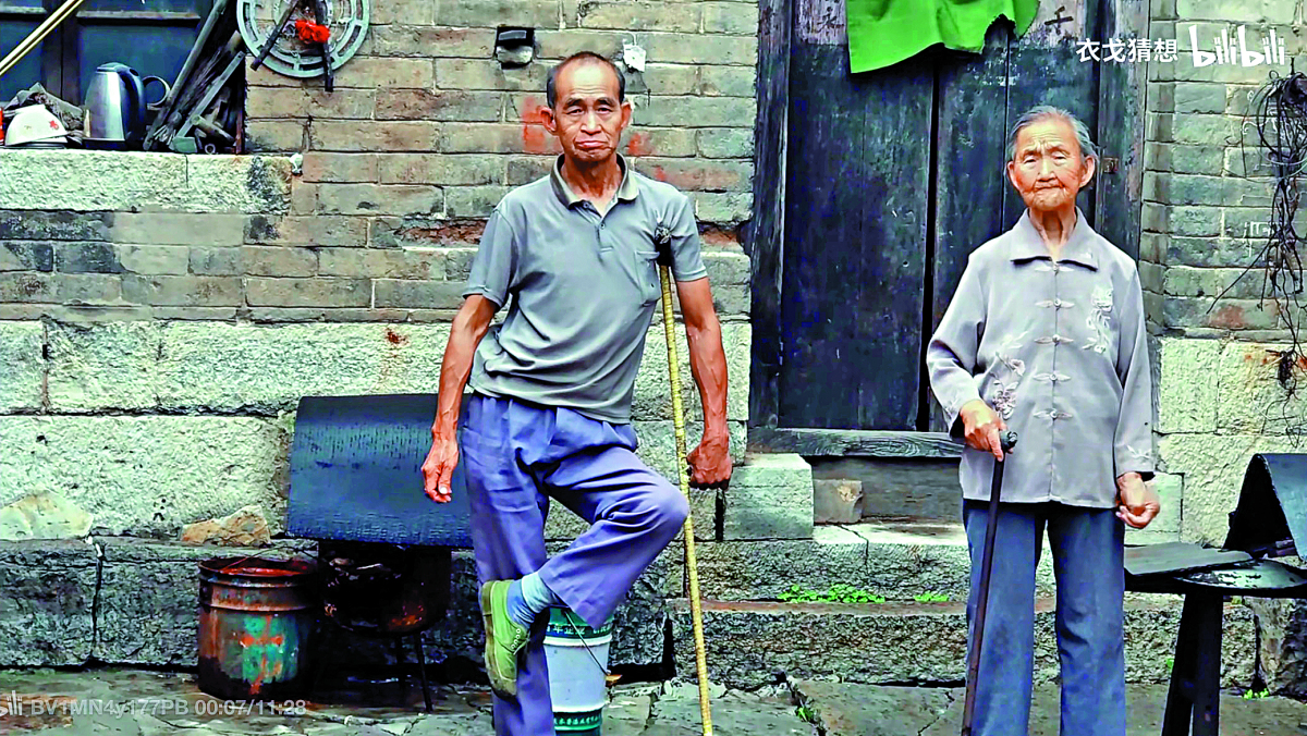 「這是我的二舅,村子裏曾經的天才少年。」視頻開篇是一個禿頂、拄枴、瘦弱的殘疾男人,「天才」在哪兒?接下來的11分鐘裏,「衣戈猜想」以幽默細膩的筆觸和日常瑣碎的生活片段緩緩展開了二舅的人生:小時候考全校第一的二舅,中學時因赤腳醫生誤診而殘疾,放棄學業成了木匠。他去過北京,又回到村裏,有過無疾而終的感情,為養女買房耗盡積蓄,如今他獨力照顧88歲老母之餘,還「什麼都能修、什麼都能幹」,成為全村人的修理工、算命師……二舅就這樣在小山村裏過着自己飽滿又堅定的一生。