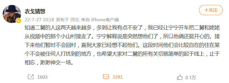 「衣戈猜想」指,知道二舅的人這兩天越來越多,「多到讓我有點不安了」,接下來二舅和姥姥暫時不會回村,直到大家已經想不起他們,希望大家對二舅的關切「就簡單地起於線上,止於相忘,渺渺神交一場」。
