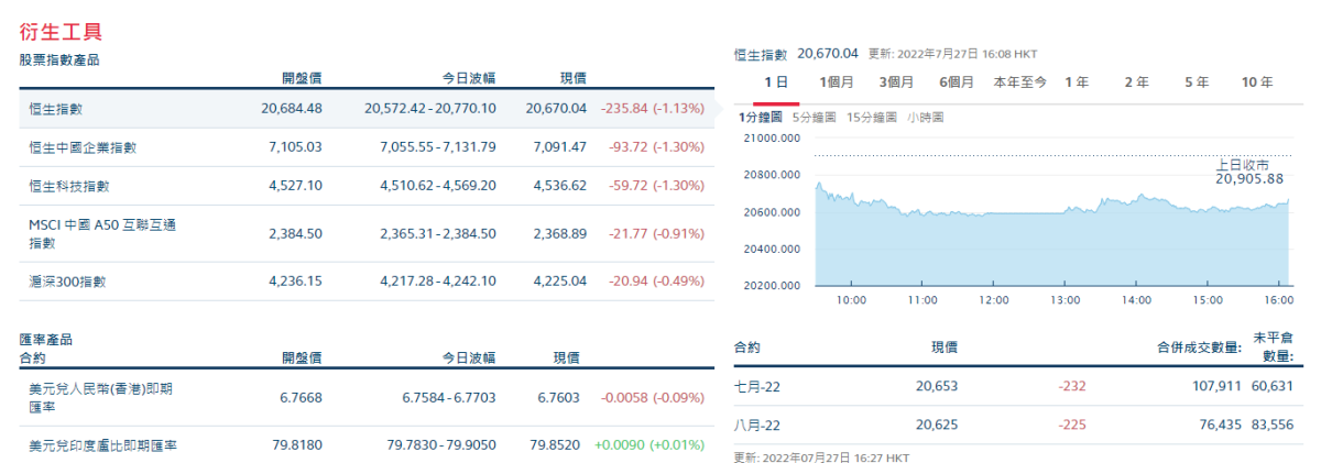 香港股市今日(27日)普遍下跌,三大指數走低,恒生指數收跌1.13%,報20670點;恒生科指收跌1.3%,報4536點;國企指數收跌1.3%,報7091點。截至收盤,港股今日上漲547隻,下跌1200隻,收平1147隻。