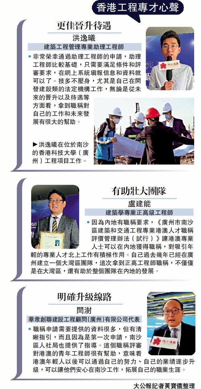 廣州南沙在全國範圍首創《廣州市南沙區建築和交通工程專業港澳人才職稱評價管理辦法(試行)》(下稱《辦法》),16名港澳工程技術人員順利通過評審並於27日獲頒發職稱證書,正式成為內地首批取得建築工程和交通工程專業職稱的港澳工程人才。這是港澳工程師第一次被納入國家人才評價系統,職稱證書全國通用,此後他們將享有與內地工程技術人員相同的晉升機會和待遇,在內地承接和開展建築工程項目,也將享受同等待遇。