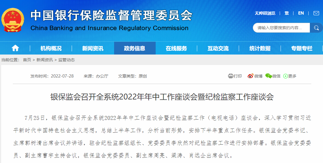 據中國銀保監會網站今日(28日)消息,7月25日,銀保監會召開全系統2022年年中工作座談會暨紀檢監察工作(電視電話)座談會。會議指出,支持地方做好「保交樓」工作,促進房地產市場平穩健康發展。要把穩定宏觀經濟大盤放在更加突出的位置,更好發揮金融逆周期調節作用,全力落實穩住經濟一攬子政策措施。
