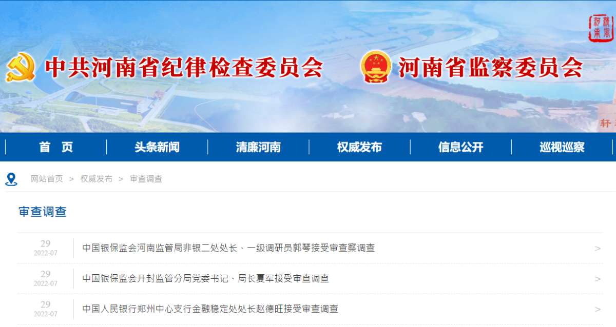 河南省紀委監委今日(29日)下午發布消息,中國銀保監會河南監管局非銀二處處長、一級調研員郭琴,中國銀保監會開封監管分局黨委書記、局長夏軍,中國人民銀行鄭州中心支行金融穩定處處長趙德旺等3人涉嫌嚴重違紀違法,接受紀律審查和監察調查。