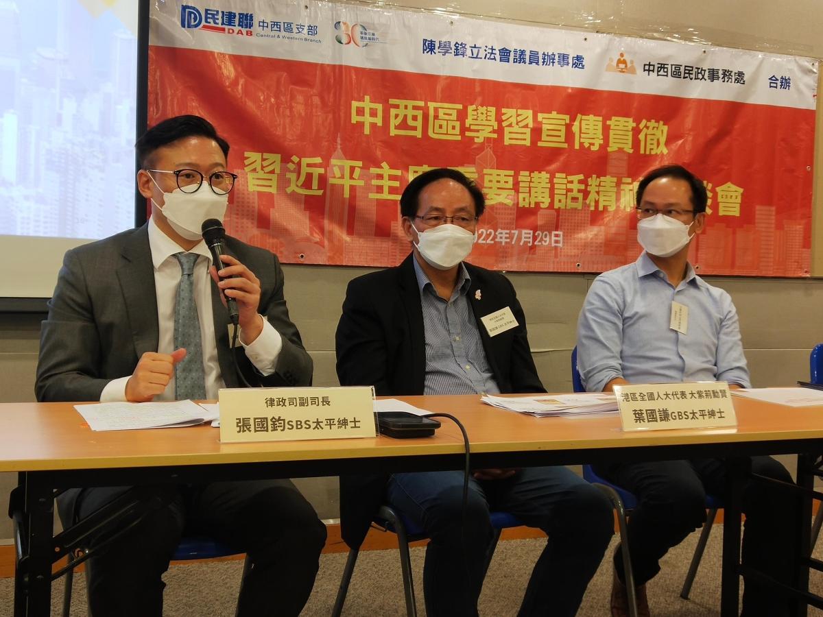 中西區民政事務處則繼7月19日、21日及25日舉辦3場座談會後,於7月29日聯同民建聯中西區支部及陳學鋒立法會議員辦事處,在堅尼地城社區綜合大樓舉辦「中西區學習宣傳貫徹習近平主席重要講話精神座談會」,邀請律政司副司長張國鈞和港區全國人大代表葉國謙作主講嘉賓。立法會議員陳學鋒、中聯辦港島工作部宣教處副處長黃鵬舉及民建聯中西區支部主席楊學明亦有發言。共約70名人士出席座談會。