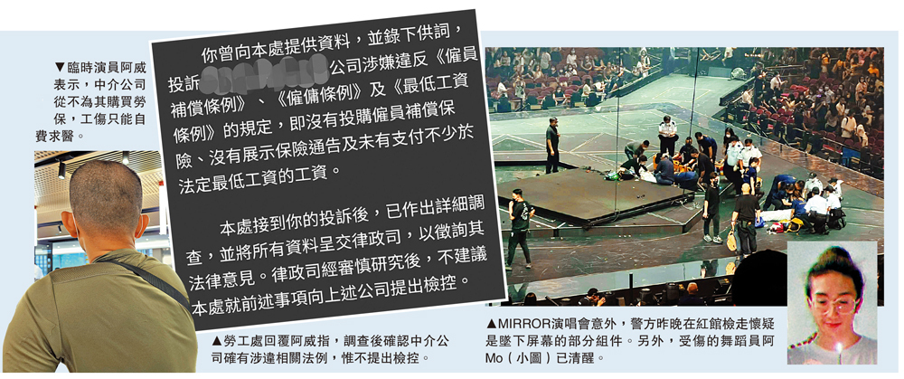 MIRROR演唱會發生意外,令舞蹈員受重傷,事件引發社會關注自由工作者的勞工保障問題。自由工作者既不受勞工法例保障,又欠缺中介公司為其投購勞工保險。有臨時演員今年向勞工處投訴中介公司未為其購買勞保,經處方調查後證明涉違相關法例,惟不提出檢控。
