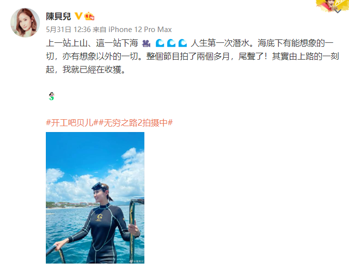 而根據陳貝兒此前在社交平台的分享——在海南省潛水,不少網友也在推測第二季是有關生態環境方面的主題。近年來國家全力推進生態文明建設,堅持人與自然和諧共生。這次《無窮之路2》的拍攝從內地的最北拍到最南,經歷過零下幾十度的大山風雪、也體驗了三十多度的灼灼烈日。「去年爬天梯,今年拍天山。」陳貝兒在第二季的預告片中如是說。如此大跨度的獨特體驗,又會呈現出怎麼樣的中國故事呢?8月25日起,《無窮之路2——無價之保》解開答案!