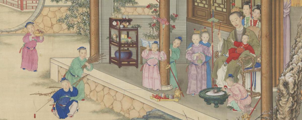 孫召華介紹,展覽的第一單元「服飾起居」意在講述春節背景下的清宮服飾文化和室內陳設。展廳中的第一件文物《乾隆帝歲朝行樂圖》讓觀眾迅速進入大雪紛飛的清代紫禁城的氛圍中。另外,這一單元中還展出了一套明黃色緞綉彩雲金龍紋男夾龍袍(吉服袍)、冠和靴。