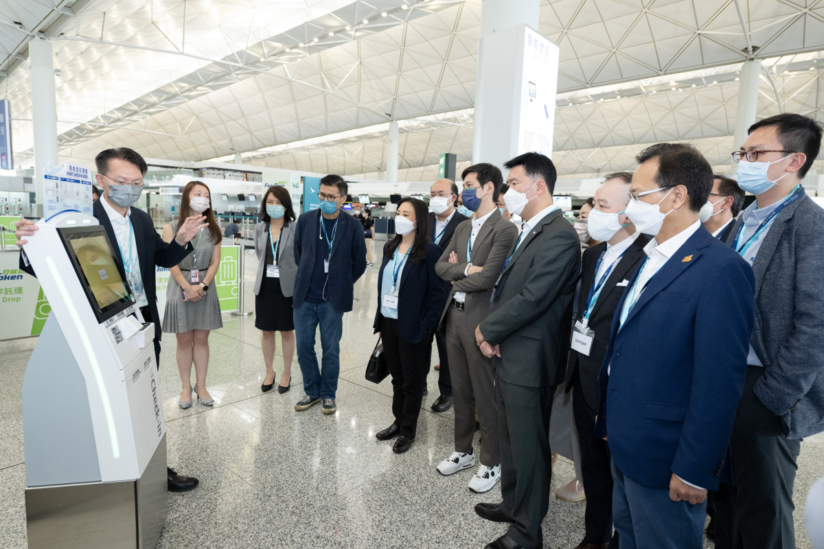 在機管局的代表陪同下,議員首先於機場行政大樓頂層遠眺機場,並聽取機管局行政總裁林天福先生簡介機場的最新發展。議員其後參觀一號客運大樓的各項「登機易」設施,包括智能登記櫃檯、自助行李託運、自助保安閘口及自助登機閘口,了解機管局如何透過無接觸式裝置和生物特徵身分認證系統等創新科技,以加快旅客辦理登機手續的流程。