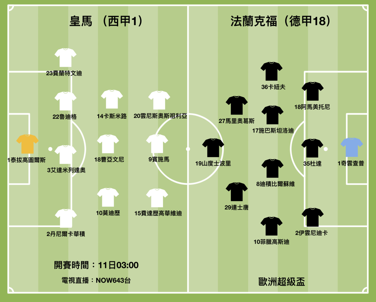 西甲勁旅皇家馬德里適逢對手法蘭克福在德甲開鑼戰1︰6大敗於拜仁腳下,在歐洲超級盃賽事有望贏波捧盃取頭威。(香港時間周四凌晨3時開賽,NOW643台直播)