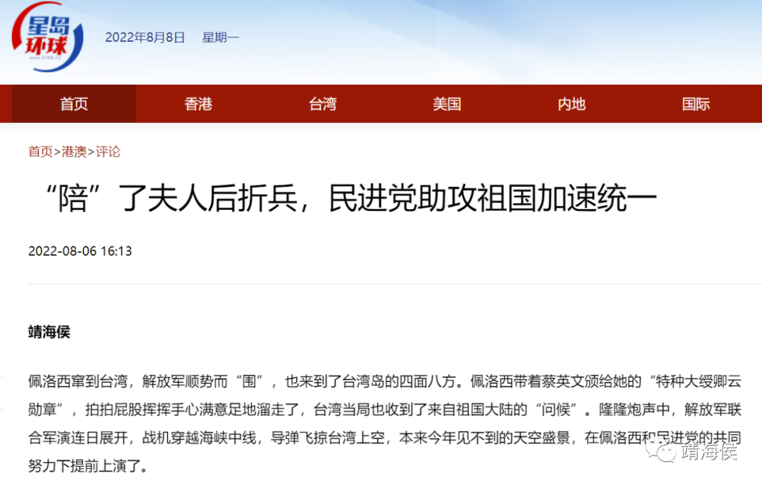 8月5日至7日,就佩洛西竄訪台灣事,受邀在香港星島新聞撰寫評論文章三篇,分別從佩洛西為什麼蠢、民進黨為什麼傻、西方列強為什麼惡等三個角度,剖解近期台海局勢的真相與走向。
