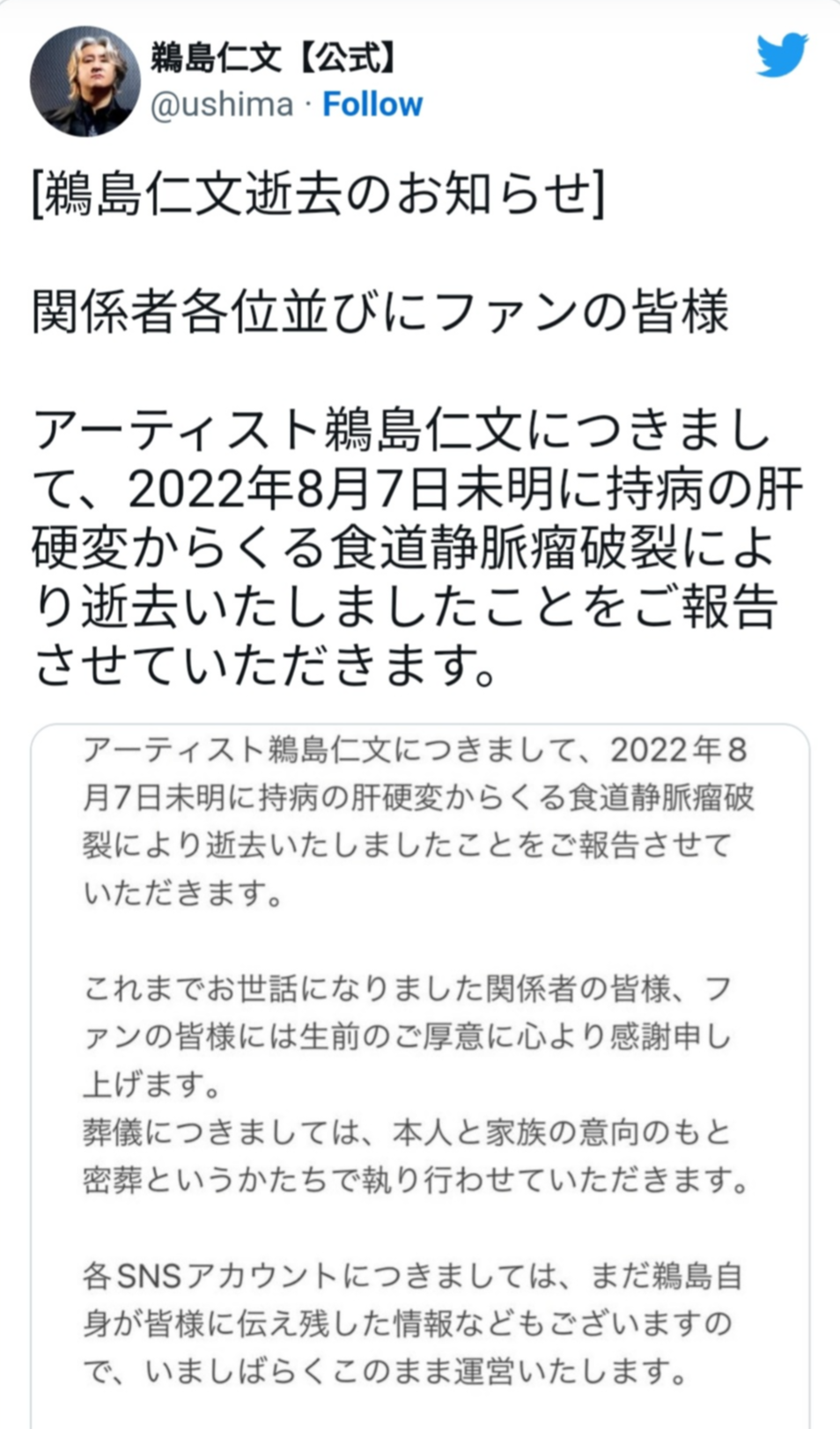 曾演唱《機動武鬥傳G鋼彈》主題曲的創作歌手鵜島仁文,在8月7日因為肝硬化引發食道靜脈瘤破裂過世,享年55歲。