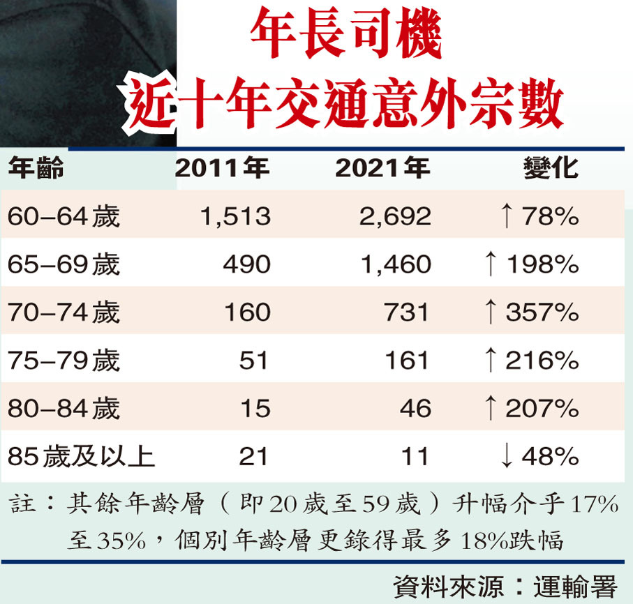陳先生的擔憂並非杞人憂天,根據運輸署的統計,70歲或以上持有效駕駛執照的人數,由2017年的44,641人,增至去年的80,863人,增幅逾八成。「銀髮族」過去十年的交通意外也幾乎直線上升,以70歲至74歲組別的升幅最驚人,由十年前的160宗,飆升至去年的731宗,升幅近3.6倍。年輕司機方面,各年齡組別期內只錄得最多三成升幅,個別組別如20歲以下人士,及50歲至54歲司機更錄得跌幅。
