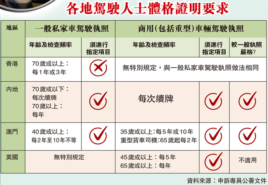 相比之下,內地、澳門及歐美國家,把私家車及商用車司機區分,私家車司機的要求較寬鬆,但也比香港嚴格,這些地區規定年長司機必須接受幾項指定檢查;商用車司機的要求更嚴,部分地區要求60歲以上司機每年進行指定項目的體檢,澳門甚至要求「搵食車」司機年滿35歲,每5年至10年檢查;重型汽車司機年滿65歲更加密至每兩年檢查一次。