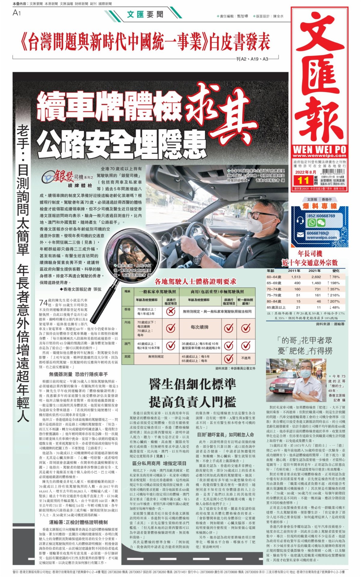 全港70歲或以上持有駕駛執照的「銀髮司機」(包括商用車及私家車等)過去5年間激增逾八成,續領車牌的制度又準備好迎接這輪老齡化浪潮嗎?根據現行制度,駕駛者年滿70歲,必須通過註冊西醫的體格檢查才能領取或續領車牌,但不少司機及醫生近日接受香港文匯報訪問時均表示,驗身一般只透過目測進行,比內地、澳門和外國寬鬆,隨時產生「公路殺手」。香港文匯報亦分析各年齡組別司機的交通意外宗數,發現年長司機的交通意外,十年間狂飆二三倍(見表),年輕群組卻只錄得二三成升幅,甚至有跌幅。有醫生坦言坊間的續牌驗身質素良莠不齊,建議特區政府向醫生提供客觀、科學的驗身標準,排查不再適合駕駛的長者,保障道路使用者。