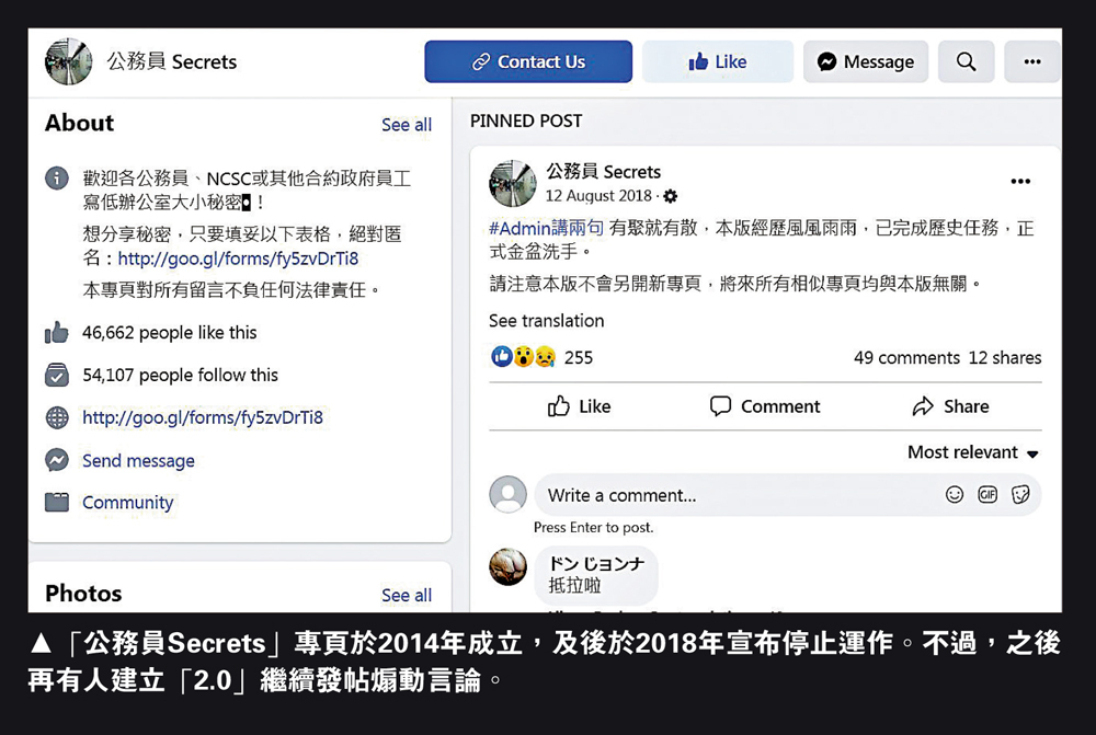 「公務員Secrets」專頁於2014年成立,聲稱是為公務員、非公務員合約僱員或其他合約政府員工提供平台,分享辦公室大小秘密。