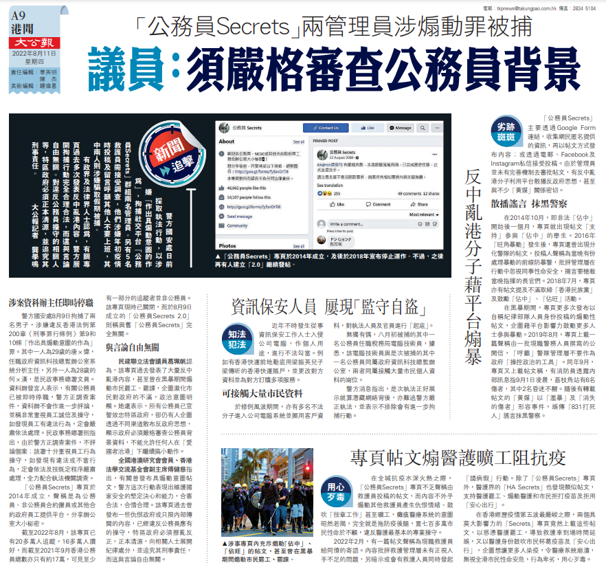 警方國安處日前採取執法行動,以涉嫌「作出具煽動意圖的作為」,拘捕社交平台「公務員Secrets」群組兩名管理員。另有5名救護員需接受調查,他們涉嫌年初疫情時投稿及留言呼籲其他人不要上班,其中兩人則涉嫌騙取假期被捕。
