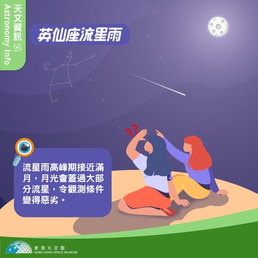 英仙座流星雨是每年的三大流星雨之一,其高峰期預估於今日出現。太空館預測在高峰期間,流星雨的天頂每小時出現率可達到100。但由於月光明亮會蓋過大部分的流星,令觀測條件變得惡劣。雖然不排除會看到一些十分明亮的流星,但數量亦寥寥無幾。