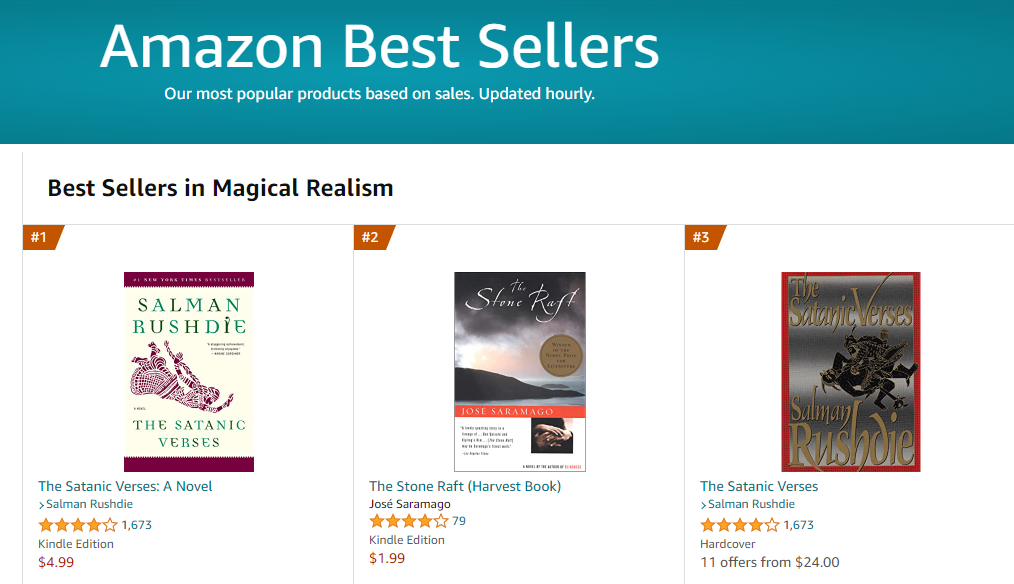 1989年,拉什迪因為小說《撒旦詩篇》收到來自伊朗的死亡威脅。有關拉什迪被刺的消息引起公眾對《撒旦詩篇》的興趣,截止香港時間14日上午11時,該書在亞馬遜魔幻現實主義暢銷商品排名第一。