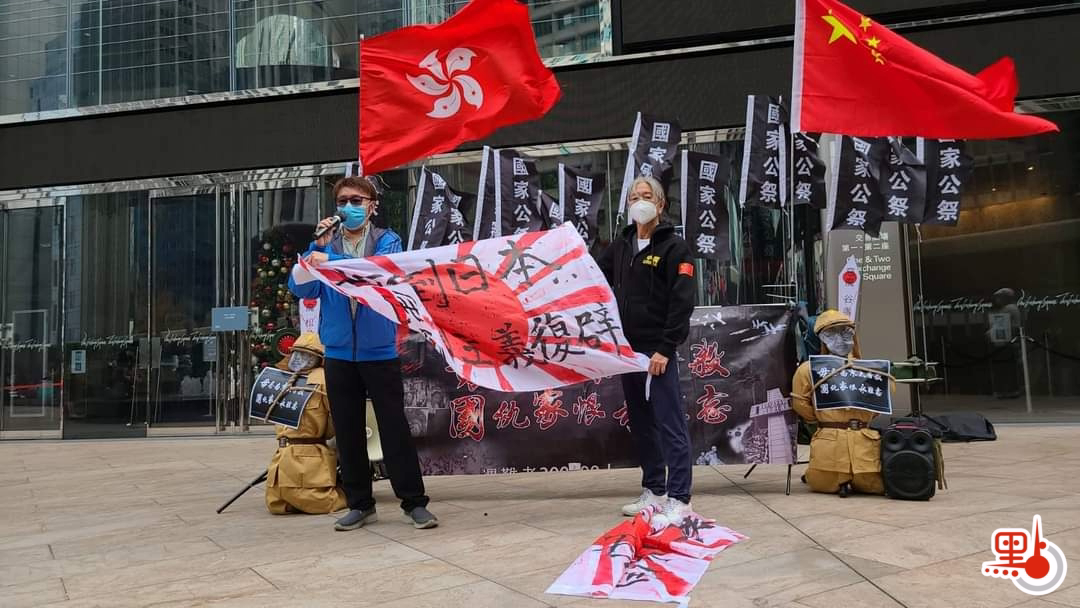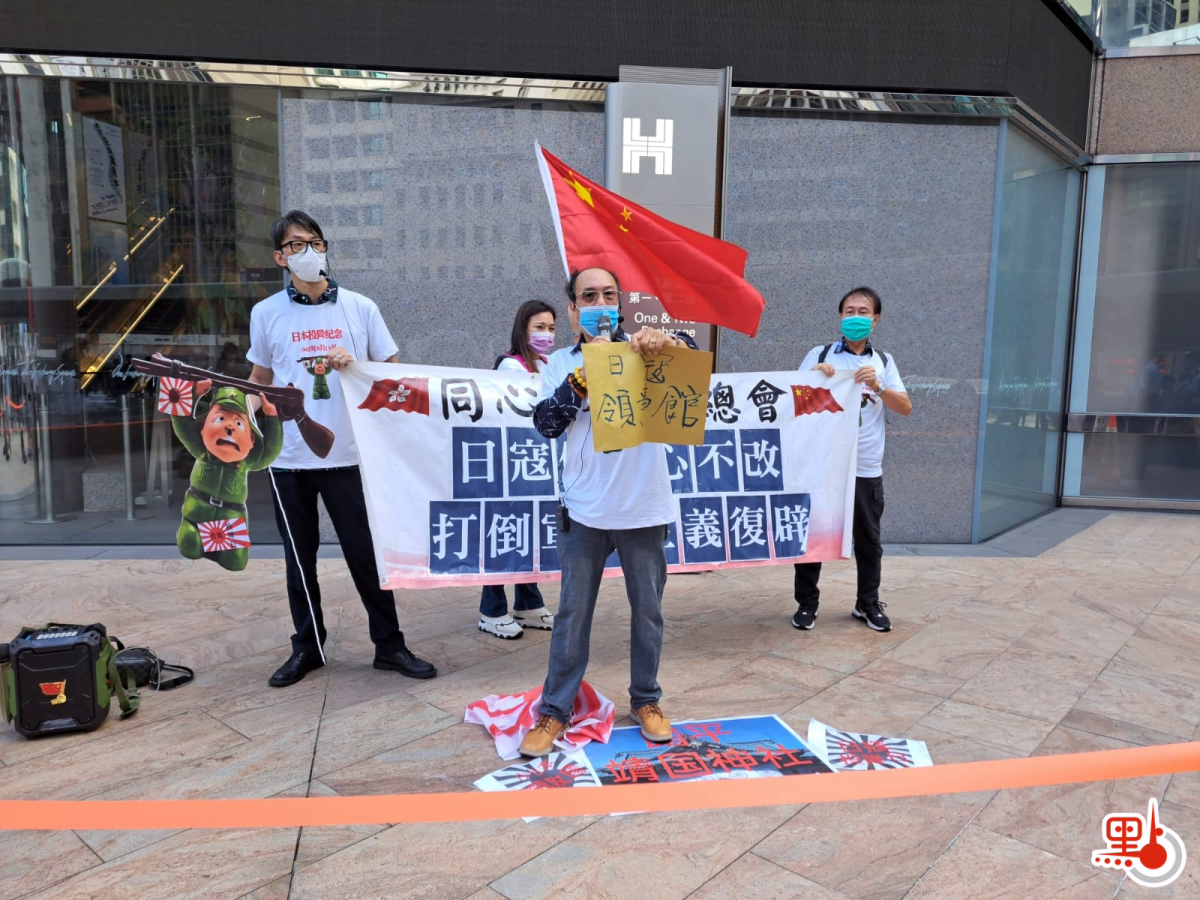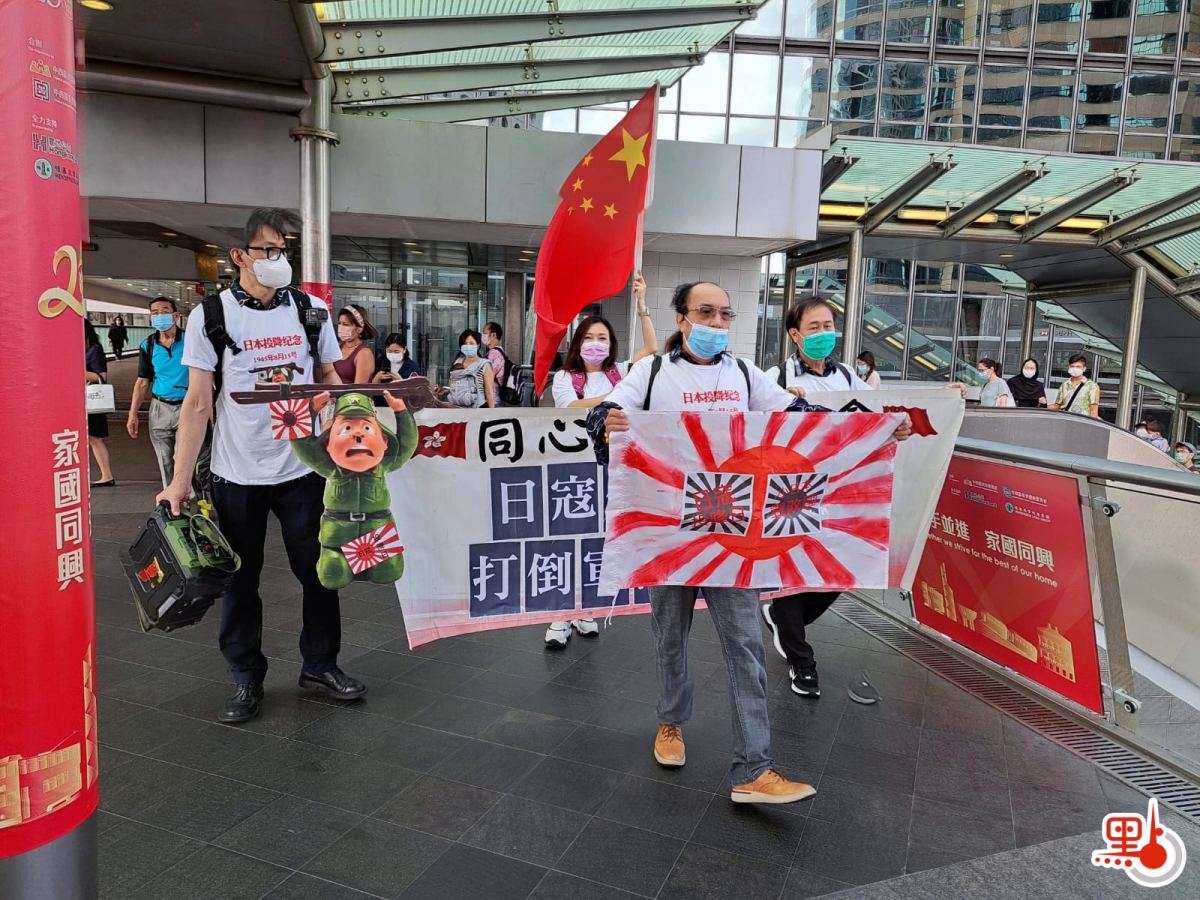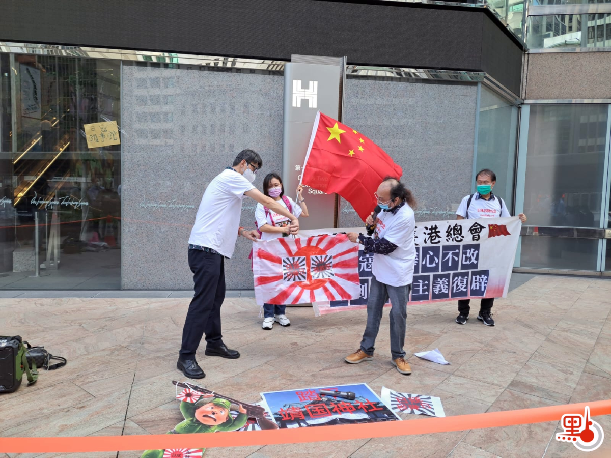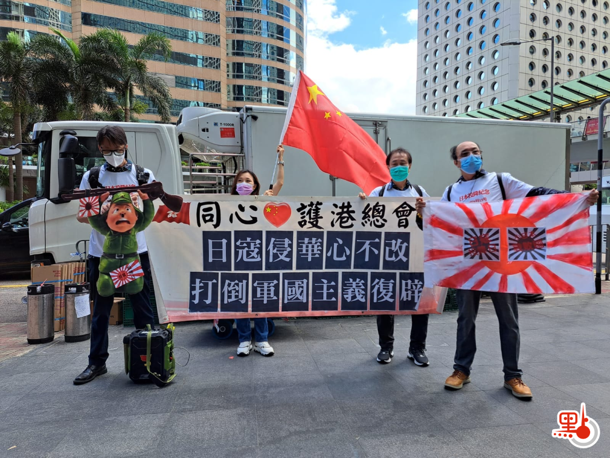 今日(15日)是日本宣布無條件投降77年。團體「同心護港」多位成員手持中國國旗及標語,由中環遊行到日本駐香港總領事館,批評日本從未就侵華道歉,且日本官員持續到供奉甲級戰犯的靖國神社參拜,是軍國主義復闢,呼籲罷買日貨及停止去日本旅行。