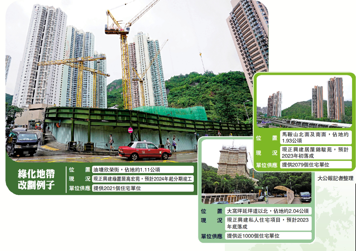 改劃合適的綠化地帶建屋是政府多管齊下土地供應策略的其中一環,政府近年透過兩階段「綠化地帶」檢視,物色到77幅用地具房屋發展潛力,合共涉及約227公頃,料可提供逾11.4萬個住宅單位。政府正進行新一輪「綠化地帶」用地檢討,將適時公布進展。