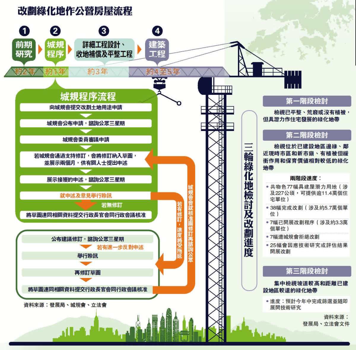 「綠地」改劃用途需時三年,審批流程不能簡化?政府曾估算發展1%「綠化地帶」,可以提供近10萬個單位。過去兩階段「綠化地帶」檢視,政府物色到的77幅具房屋發展潛力用地,近半38幅完成改劃,助不少市民完成「上車夢」,但當中亦有部分改劃建議,因在城規會遇到大量反對意見,甚或遭司法覆核,發展一再拖延,甚或被迫叫停。