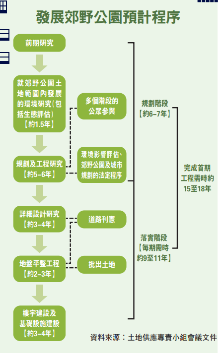 郊野公園發展要經過《郊野公園條例》及《環境影響評估條例》的法定程序,改劃土地用途亦要根據《城市規劃條例》進行評估及諮詢。土地供應專責小組當年的諮詢文件提到,發展郊野公園用地預期需時至少10年。不過,劉炳章認為,發展郊野公園可以透過行政主導,提速發展。他以近年發展過渡性房屋為例,指出不少項目在兩年內就有單位供應,其中一個位於元朗、提供約1800個單位的項目,2020年8月底申請改劃用地,到今年5月已經竣工、6月有居民入住,整個過程只用了約22個月,「這些項目都要做足環境評估、交通評估等技術評估及法定程序,沒有豁免,可見在行政主導下,很多事可以做得好快。」
