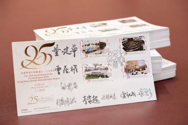 今年是香港特別行政區成立25周年,立法會主席梁君彥今日(19日)在社交媒體上表示,為紀念及慶賀這別具意義的重要里程碑,特意邀請歷任和現任行政長官及立法會主席在香港郵政發行的精美「香港特別行政區成立二十五周年」首日封上簽名留念。