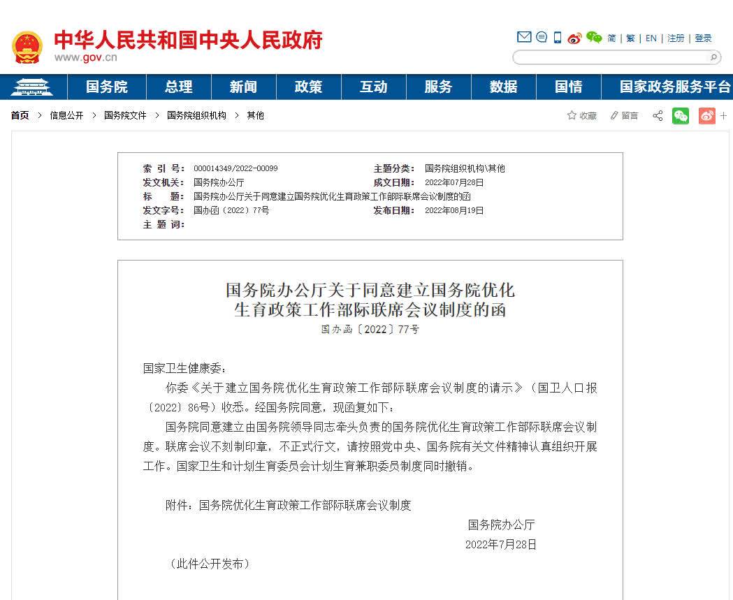 8月19日,國務院辦公廳關於同意建立國務院優化生育政策工作部際聯席會議制度的函發布。國務院同意建立由國務院領導同志牽頭負責的國務院優化生育政策工作部際聯席會議制度。國家衞生和計劃生育委員會計劃生育兼職委員制度同時撤銷。