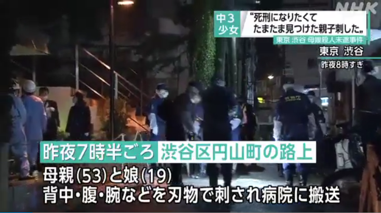據報道,該名女學生於當地時間20日晚約7時20分,在澀谷區一街道手持菜刀砍傷一名53歲婦女及其19歲女兒,兩人均受重傷。報道指,這位女學生用菜刀砍傷兩人,警方其後在她的口袋內搜查到另外兩把刀。女學生表示並不認識兩名傷者,並聲稱「想被判死刑」,目前,該女學生已因謀殺未遂被捕,警方正在調查案件細節。