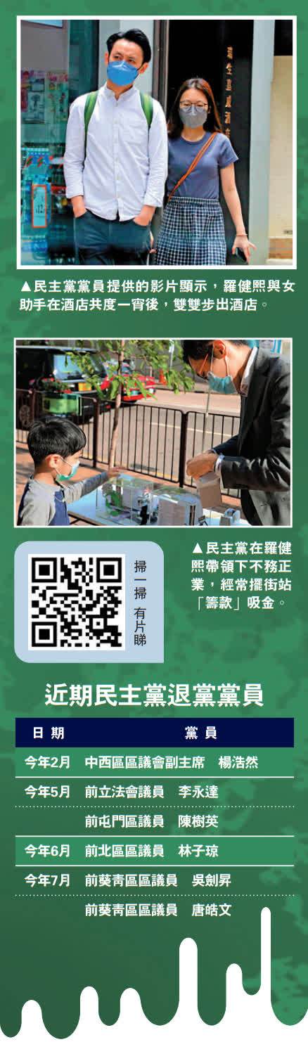 江河日下的民主黨愈做愈霉,經歷數波退黨潮,至今仍持續有會員退黨,民主黨頭目羅健熙卻「溝女大過天」,搭上新女友的羅無心黨務,民主黨亡黨在即。《大公報》近日接獲民主黨黨員報料,提供詳細影片及相片,直擊羅健熙與其女助手多次往酒店「爆房」,每次溫存一夜後,兩人一同上班,寓工作於溝女,女助手隨即亦變成女友。