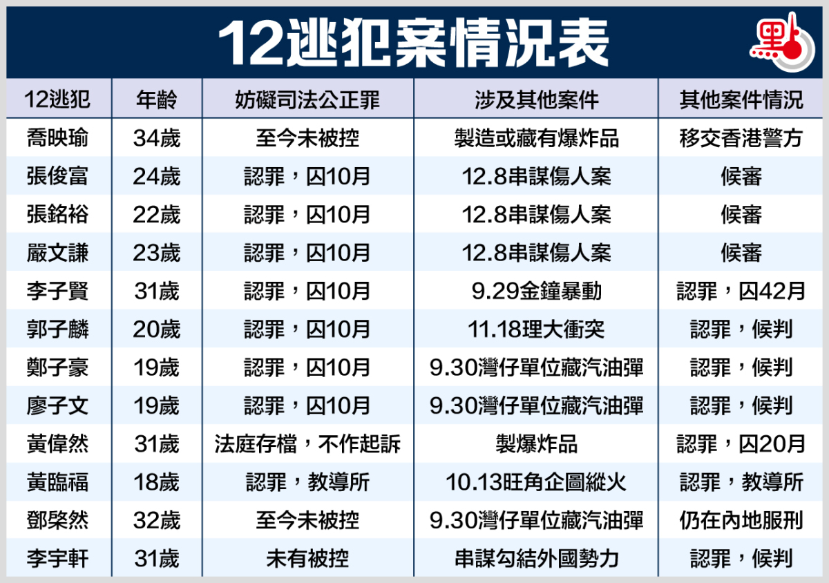 12名逃犯前年涉嫌偷渡離港,在內地水域被捕。12人分別為李宇軒、張俊富、張銘裕、李子賢、郭子麟、鄭子豪、廖子文、黃偉然、鄧棨然、嚴文謙、黃臨福及喬映瑜,犯案時年齡介乎16歲至31歲。其中10人已於早前先後被押送回港,而鄧棨然及喬映瑜則留在內地服刑。根據新華社消息,庭審披露鄧棨然及喬映瑜在準備偷渡前期已與「上家」商議偷渡計劃,並被安排組織策劃偷渡。鄧棨然負責購買及駕駛偷渡快艇,並獲安排學習基本駕駛快艇的技能,而喬映瑜則負責與其他涉案人員聯絡,二人被控組織他人偷越邊境罪。