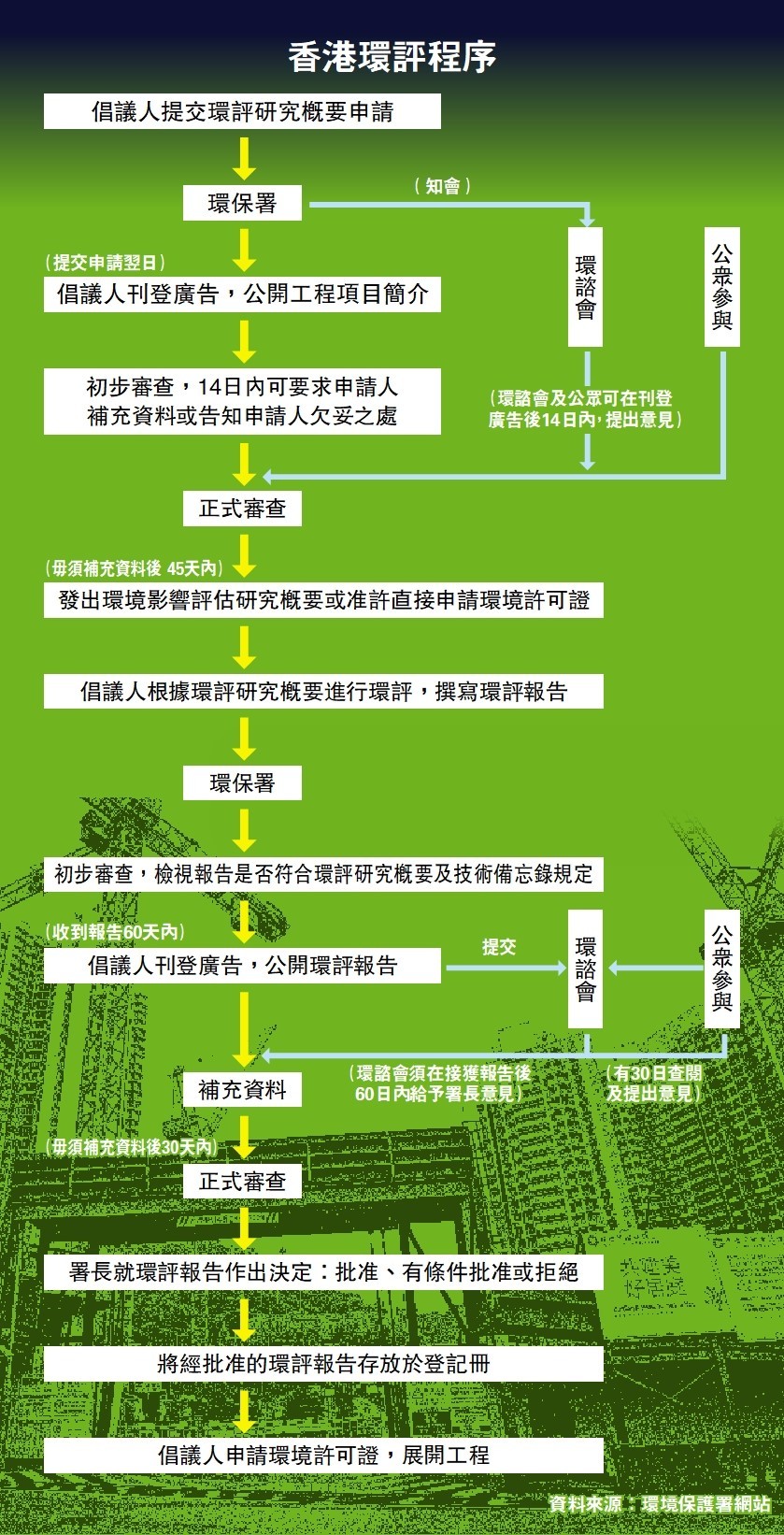 根據《條例》,環境諮詢委員會(環諮會)作為諮詢機構,會就「指定工程項目」的環評報告,向環保署署長提交意見,但其意見對署長後續批准或拒絕報告的決定不具約束力,工程能否取得「環境許可證」,最後決定權在於環境保護署署長。