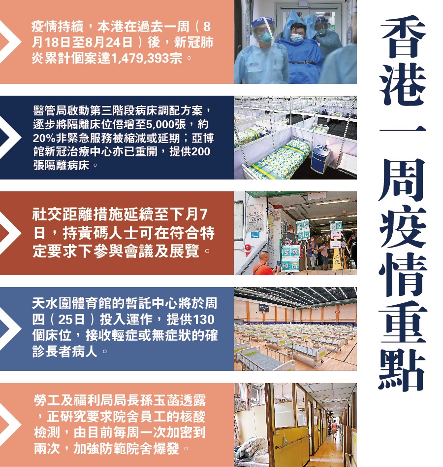 2)醫管局啟動第三階段病床調配方案,逐步將隔離床位倍增至5,000張,約20%非緊急服務被縮減或延期,包括非緊急手術、治療及日間服務等,亞博館新冠治療中心亦已重開,提供200張隔離病床。