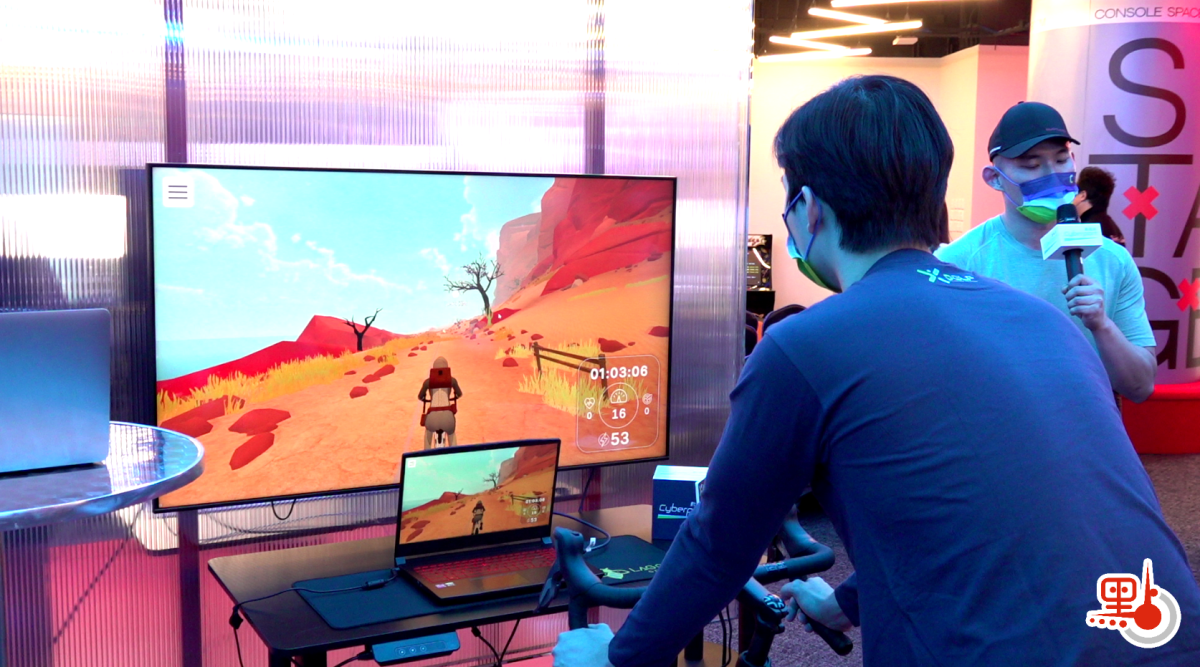打完卡後,第二站,運動科技遊戲區打機,現場設有多款體驗遊戲,單車遊戲「Dustland Rider」就是其中一款。這款遊戲與平日的冒險遊戲相似,有多人遊戲模式,市民在遊戲內需要通過踩單車推進劇情,以及做任務贏取獎勵,完成最終目標。單車的阻力、速度等會模擬遊戲場景作出改變,可以一邊玩樂之餘一邊運動。另外場內還設有籃球、賽車等動感體驗裝置,喜歡打機的市民可以玩盡全場。
