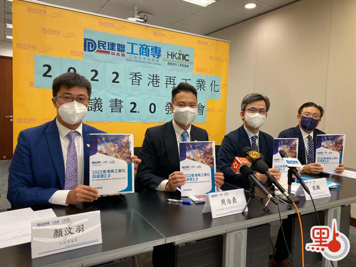 立法會議員、民建聯工商專業委員會主席周浩鼎今日(26日)連同另一名立法會議員、民建聯人力事務發言人顔汶羽,以及香港青年工業家協會會長戴麟、常務副會長高鼎國,共同發布「2022香港再工業化倡議書2.0」。倡議書聚焦培訓人才的環節,冀為香港再工業化提供適切的人才支援產業。