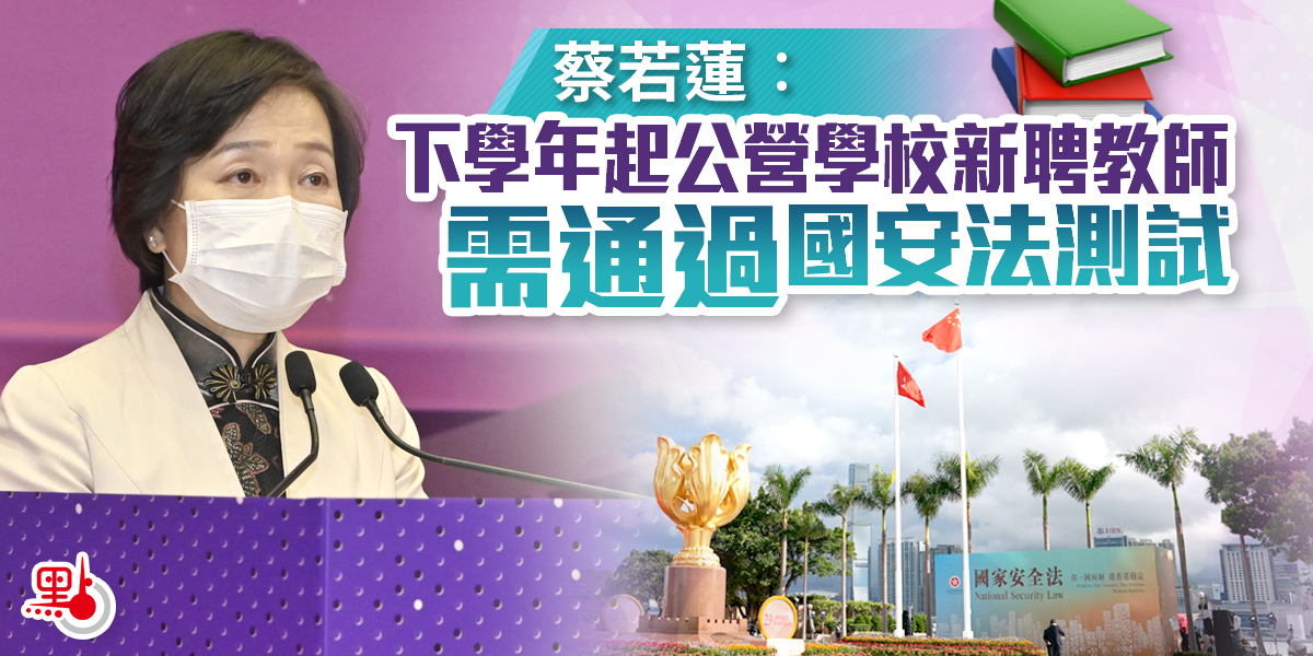 公務員事務局要求新入職公務員通過《基本法及香港國安法》測試。教育局局長蔡若蓮今日(28日)在電視節目中表示,本學年起,新聘的編制職位教師已經要通過基本法測試;而下個學年起,教育局的要求將與公務員事務局看齊,在測試中加入國安法元素,往後再按需要,考慮擴展至其他學校。