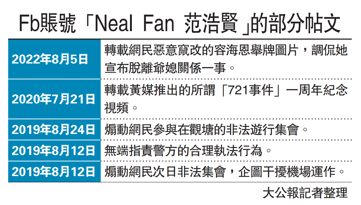 Facebook賬號「Neal Fan 范浩賢」上的內容,近期主要涉及日常生活分享,但翻看過往帖文,其中不乏調侃政治人物,甚至縱暴煽暴、醜化警察等內容。近日,他便就新民黨立法會議員容海恩登報宣布脫離爺媳關係一事,轉發了惡意竄改容海恩2019年在逃犯條例法案委員會「雙胞胎」鬧劇期間,因不滿攬炒派議員惡意擾亂議會秩序而舉牌「這個不是會議」的相關圖片。香港國安法正式落地實施後半個多月,他又在2020年7月21日頂風作案,轉發由「黃媒」《100毛》創作的所謂「721事件」一周年紀念視頻。