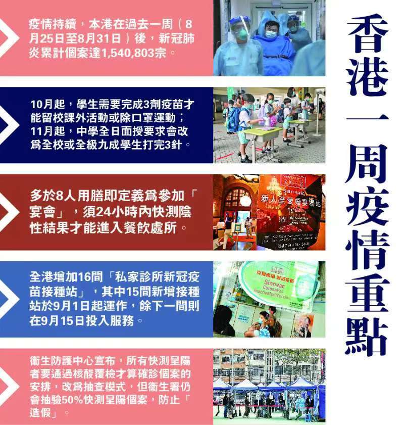 2)開學在即,特區政府表示,由10月起,學生需要完成3劑疫苗才能留校課外活動或除口罩運動;11月起,中學全日面授要求會改為全校或全級九成學生打完3針。
