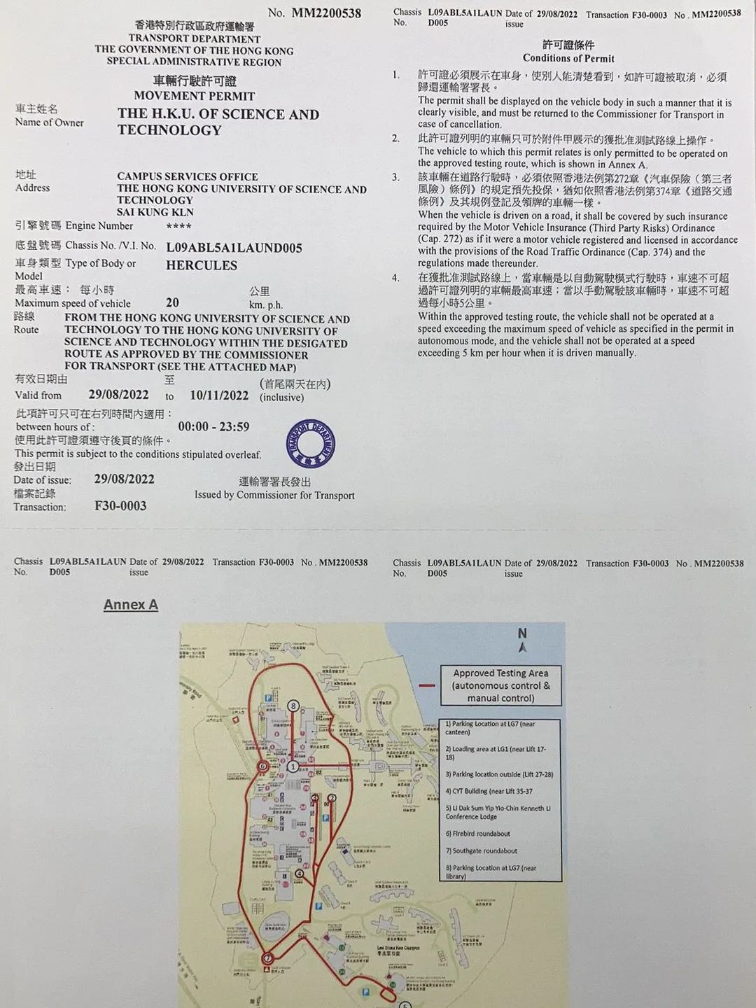 Hercules於2020年10月28日入駐港科大,開始香港運輸署的長期測試,截止目前,共獲得階段性的車輛行駛許可證5個,並成功完成595個小時94項測試任務。據了解,擁有了正式牌照的無人車,活動範圍更大、護航要求更低,對無人駕駛技術在香港的產業化落地有極大的促進作用。