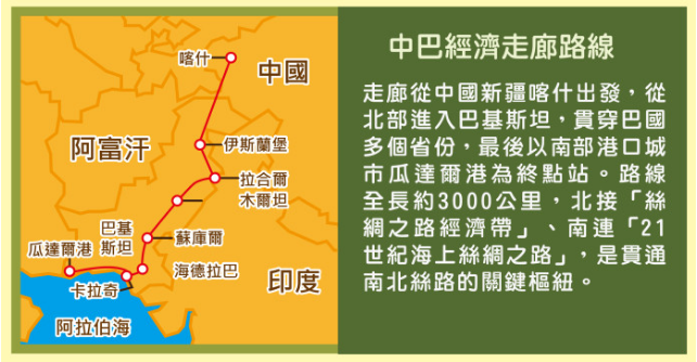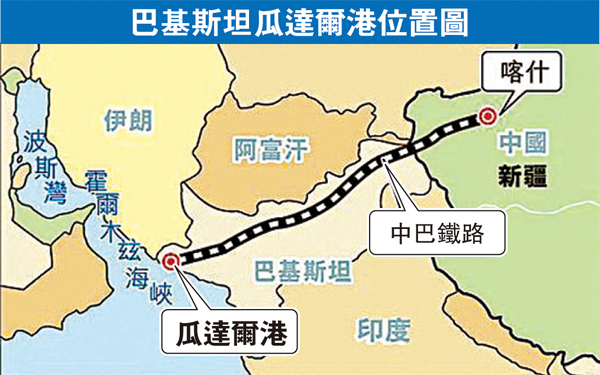 瓜達爾港是位於巴基斯坦西南部俾路支省的深水港,和伊朗相鄰,也是巴基斯坦第三大港口,距離巴基斯坦首都卡拉奇約460公里,鄰近霍爾木茲海峽,是巴基斯坦通往波斯灣和阿拉伯海的大門,戰略位置重要。2013年5月,中國國務院總理李克強訪問巴基斯坦,雙方決定建設「中國-巴基斯坦經濟走廊」連接瓜達爾港和中國新疆。