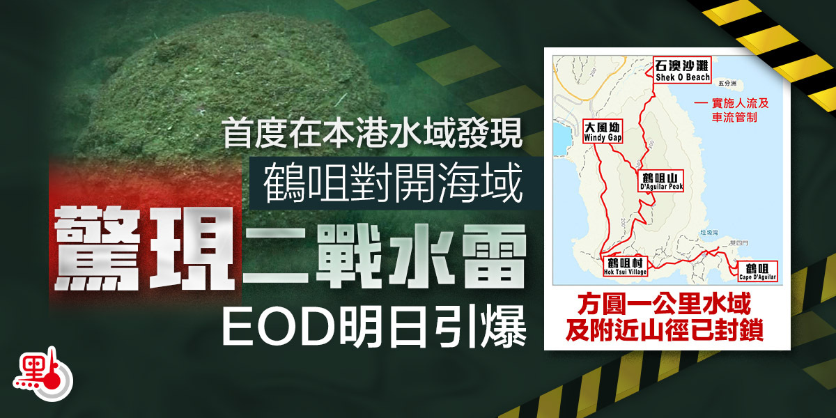 另外,由於處理水雷時將會發生巨響並可能會激起浪花,警方亦於今日中午12時起封鎖附近一帶山徑,禁止遊人走近,以策安全。鶴咀一帶範圍的空域亦會由明日早上9時至下午3時列為臨時限制飛行區。