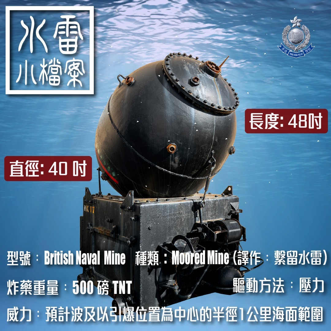 警方署理高級炸彈處理主任李展超表示,水雷不會對市民及船隻構成即時危險,但從相片可見,這枚水雷狀態現時非常完整,不排除裏面炸藥仍然有效。而由表面看,按警方檢視、評估,組件仍在裏面。他指,由於水雷在較為淺水區位置被發現,公眾潛水或船隻航行期間有機會接觸到,若人或船隻不慎,或故意干擾這枚水雷,爆炸風險不能忽視。