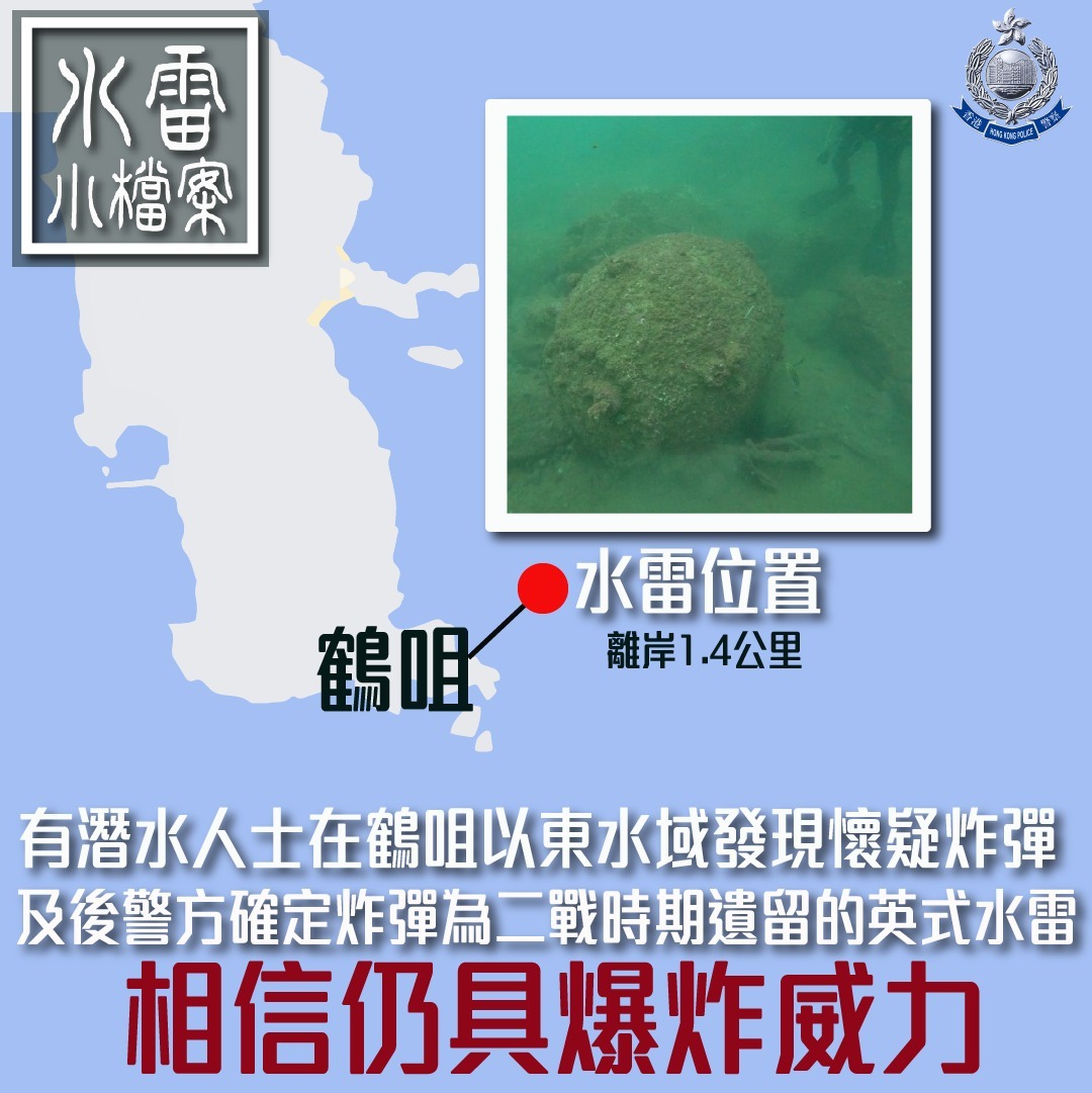 警方在8月9日接獲一名市民報告,指在鶴咀以東海域進行潛水活動時發現一枚懷疑炸彈。警方隨即進行調查,並在8月19日確定懷疑炸彈位於鶴咀東北約1.4公里的15米深海床。爆炸品處理課人員其後亦前往現場進行檢驗,確定炸彈為一枚二戰時期遺留的英式水雷,呈圓球狀,高約1米,長約1.5米,估計重約1噸。該水雷雖沒有即時危險,惟內藏的500磅高性能炸藥相信仍具爆炸威力,爆炸品處理課人員遂決定在水底處理該水雷,解除有關威脅。