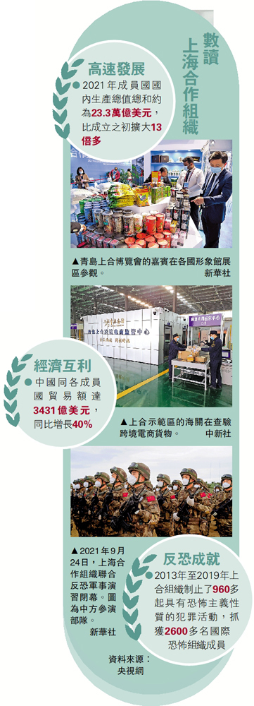 遵循「上海精神」,上合組織將來自不同地域、處於不同發展階段、有着不同文明傳統的國家凝聚在一起,產生強大的集體之力、團結之力、合作之力。在上合組織框架下,各國合力走出「結伴不結盟、對話不對抗」的新路,在涉及彼此核心利益和重大關切問題上堅定相互支持;合作打擊「三股勢力」,堅決遏制毒品走私、網絡犯罪、跨國有組織犯罪蔓延勢頭……20多年來,上合組織取得輝煌發展成就,積累了豐富合作經驗,成長為當今世界幅員最廣、人口最多的綜合性區域組織,為構建新型國際關係和人類命運共同體作出重要理論和實踐探索。