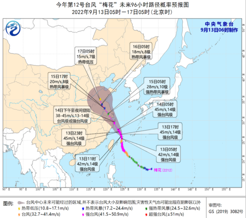 中央氣象台今日(13日)表示,颱風「梅花」已於今日凌晨移入東海南部海面,加強為強颱風,將於明天下午至夜間在浙江溫嶺到舟山一帶沿海登陸。中央氣象台今晨已將颱風預警提升至橙色預警,僅次於最高級的紅色預警。