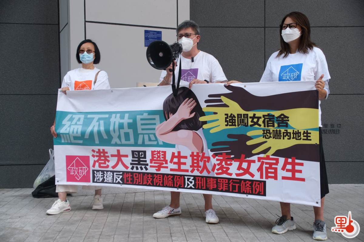 香港大學宿舍利銘澤堂日前發生非本地生被騷擾事件。有內地女生在香港大學利銘澤堂內遭5名本地學生騷擾及調戲,涉事男生不斷敲打女生房門,以輕佻猥瑣語氣用英語和普通話作性騷擾及身份歧視,事件惹起各界公憤,儘管校方已對涉事學生作出處分,可是連日繼續有團體以不同方式抗議事件。香港政研會及香港大學畢業生聯席今日(13日)到警察總部舉報事件,香港政研會主席鄧德成時表示,要求警方主動介入調查事件,嚴懲違法者。