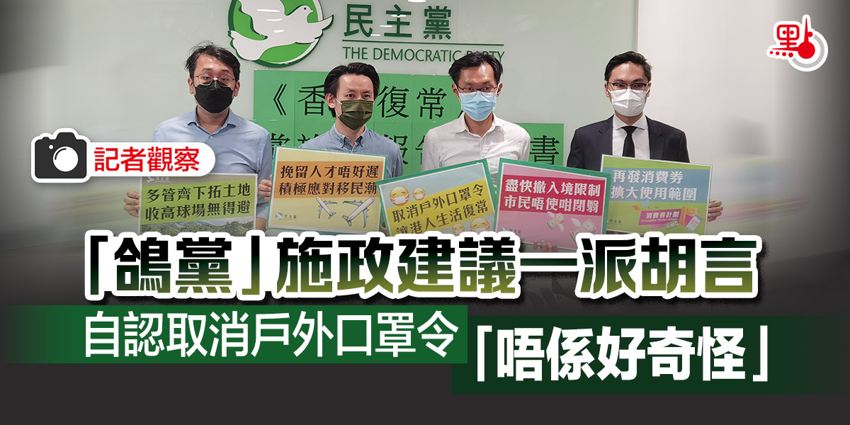 其中在醫療方面,「鴿黨」今次無視本港第五波疫情反彈的嚴峻形勢,提出鬆綁建議,鼓吹要盡快撤銷入境限制,及取消或放寬「所有不必要或沒有充分科學理據的社交距離措施」,當中包括取消戶外地方戴口罩的規定。深水埗區議員袁海文揚言「戶外傳染少之又少」,又宣稱有「客觀數字」顯示內地和台灣地區的戶外傳染個案極少,因此建議香港效仿,但並未指出「客觀數字」和「科學依據」出自哪一位專家或哪一項研究。點新聞記者追問有無想過香港單日確診高達幾千宗,是否仍然認為即使戶外不佩戴口罩都不會被傳染,民主黨主席羅健熙表示,疫情持續兩年多,群組感染多為室內傳播,認為沒有充分科學理據證明戶外佩戴口罩能夠有效預防感染,自認該項建議「唔係好奇怪嘅意見」。