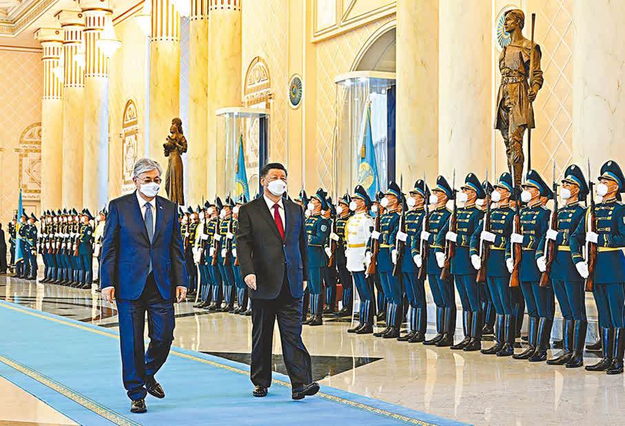 托卡耶夫為習近平舉行隆重歡迎儀式。兩國元首共同登上檢閱台,軍樂團奏中哈兩國國歌。習近平在托卡耶夫陪同下檢閱儀仗隊。