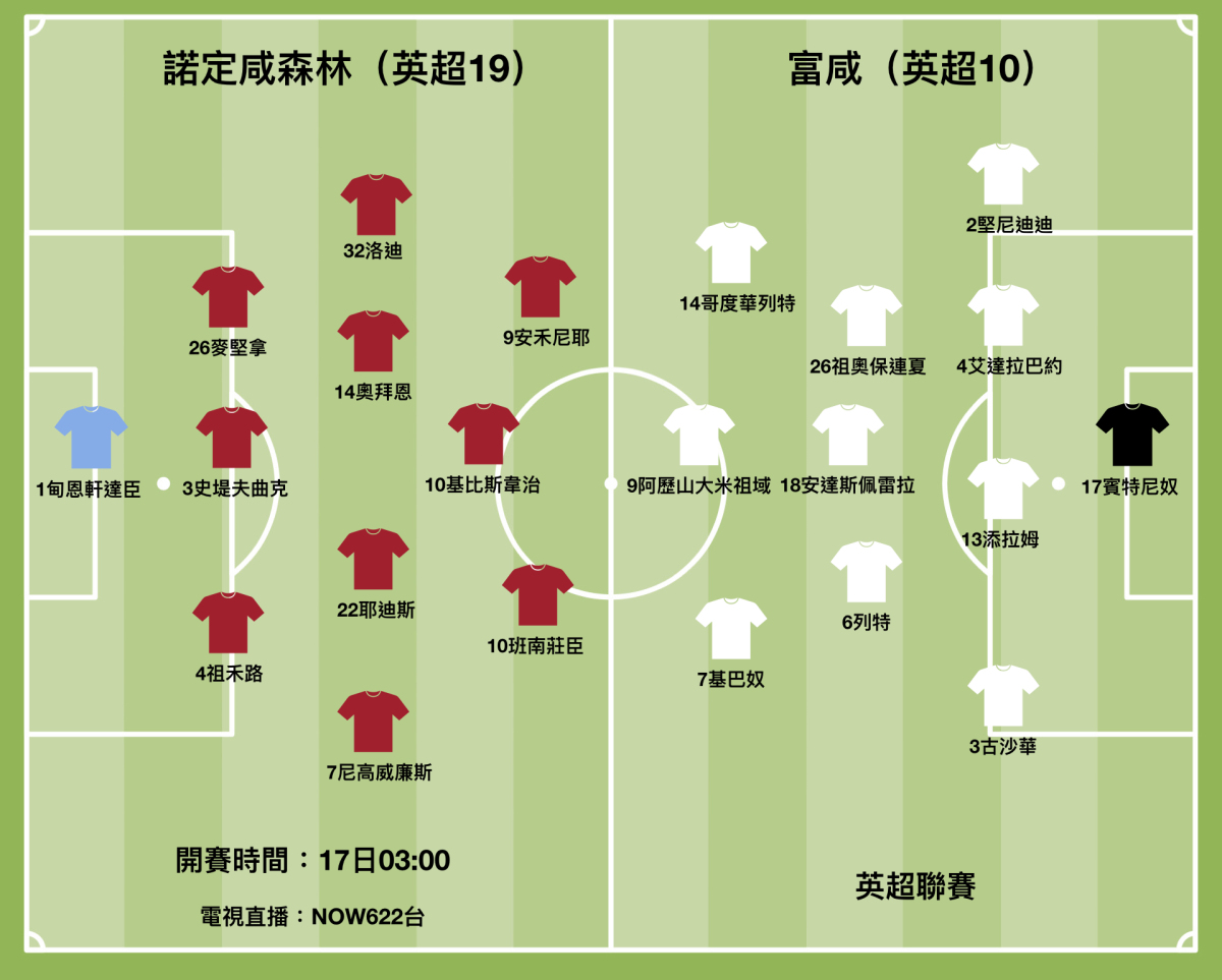 富咸雖然在季初憑阿歷大山米祖域的勇銳表現,一度有主場賽和利物浦2:2、主場勝賓福特3:2的代表作,但聯賽盃作客負卡維尼、聯賽客負阿仙奴和熱刺,該隊累計作客3連負7仗未捷,說他們勝算在森林之上也相當牽強。兩隊「海軍鬥水兵」,賽和並不稀奇。